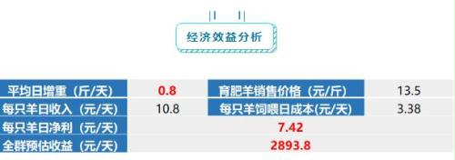 羊群平均日增重0.8斤,若按育肥羊销售价格13.5元/斤计算,每只羊日净利可达7.42元,全群(390头)预估日收益可达2893.8元,效益可观!